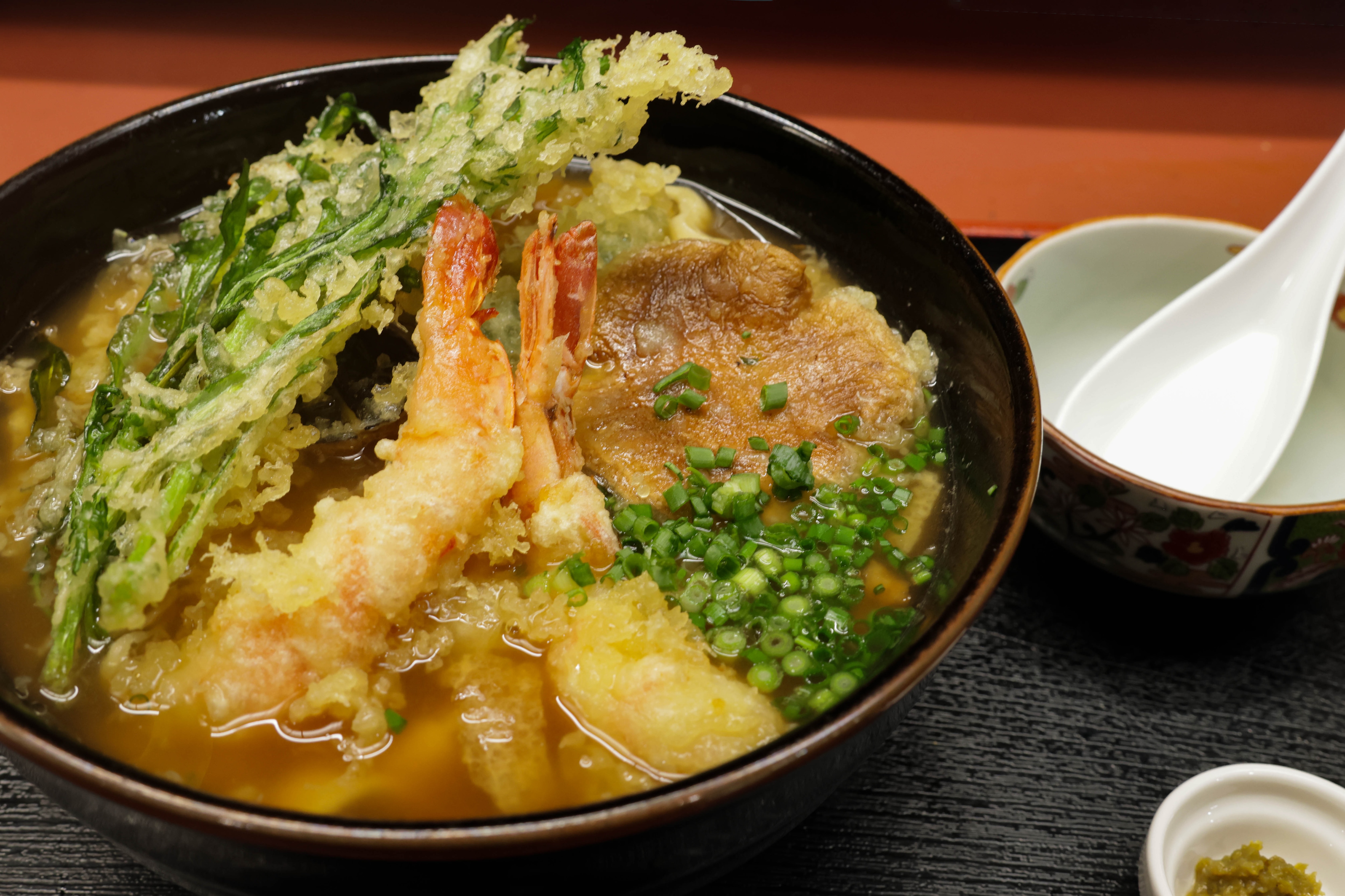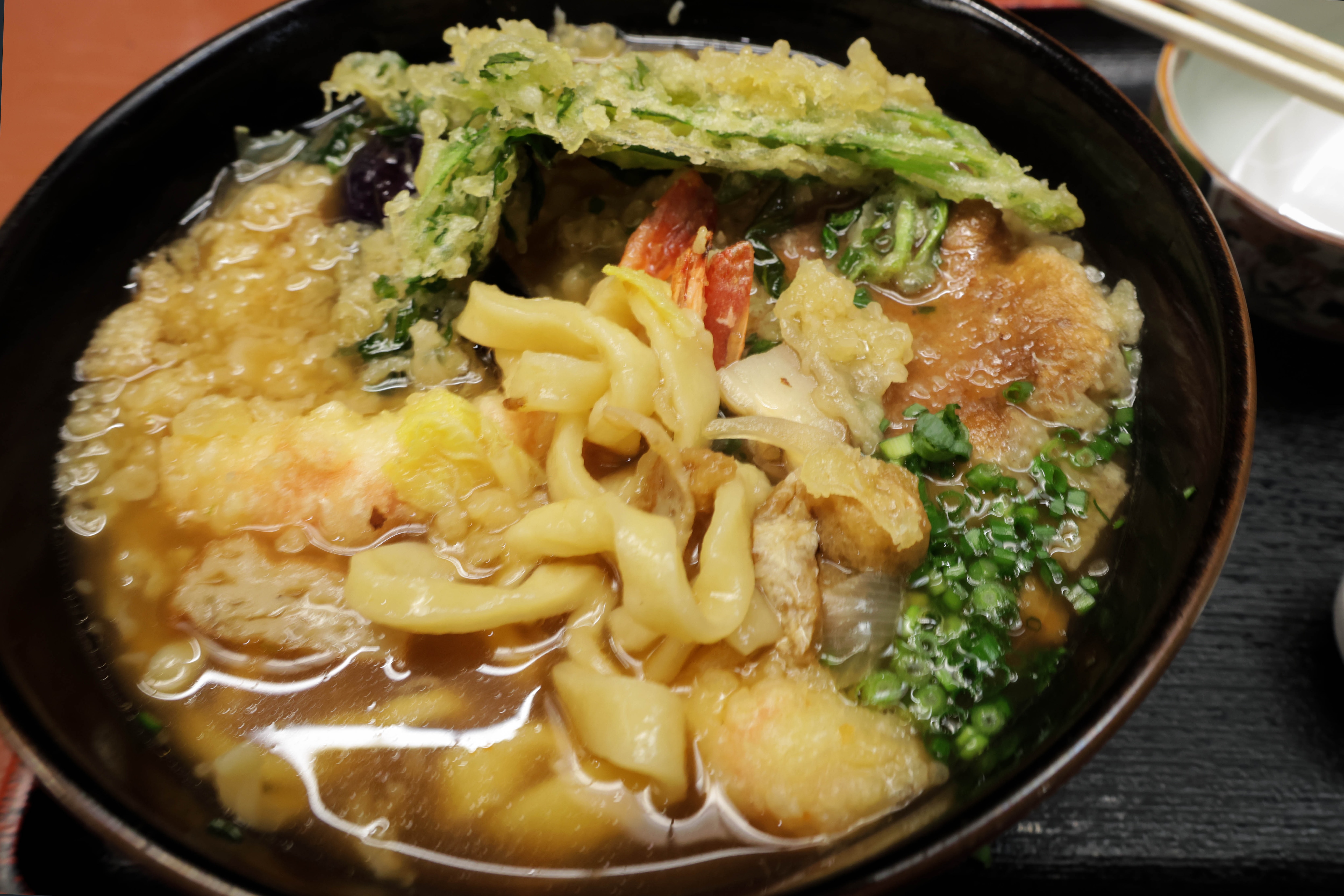 写真の天ぷら「押包丁」は、揚げたてサクサクの天ぷらがのった贅沢な一品。海老天の香ばしい風味とつるっとした麺の食感が絶妙にマッチし、見た目にも食欲をそそります。