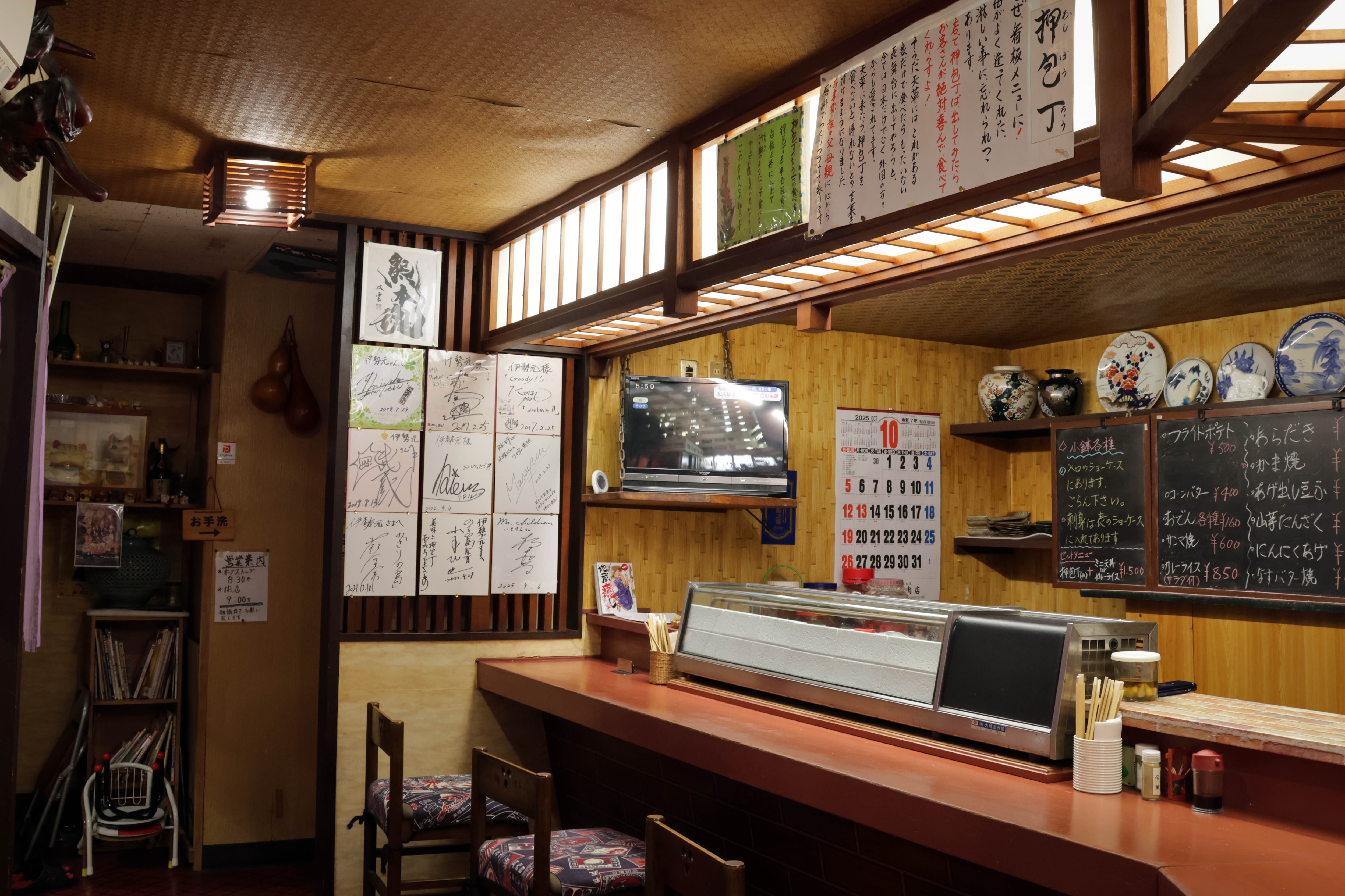 入り口はショーケースがあり、小鉢やお刺身は好きなものを選べるセルフスタイルです。さらに、カウンター横にはおでん鍋もあり、季節を問わずほっとできる味が楽しめます。