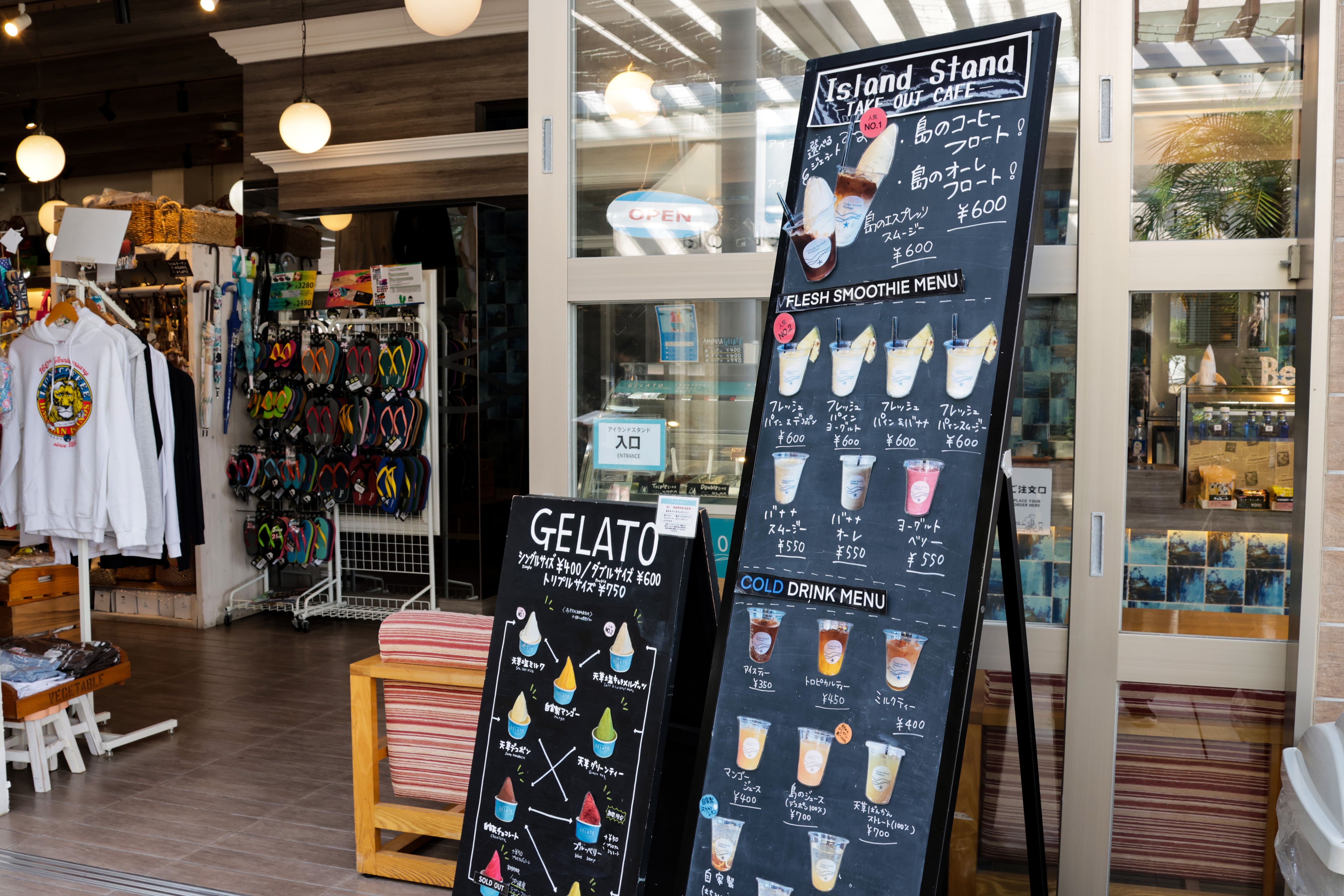 アイス気分でない時には、フレッシュフルーツのスムージーがおすすめです。また、珈琲もジェラートも楽しみたい欲張りなあなたには「島のコーヒーフロート」や「島のオーレフロート」が最適。観光途中の休憩や買い物の合間に、ふらりと立ち寄りたくなる魅力あふれるカフェです。