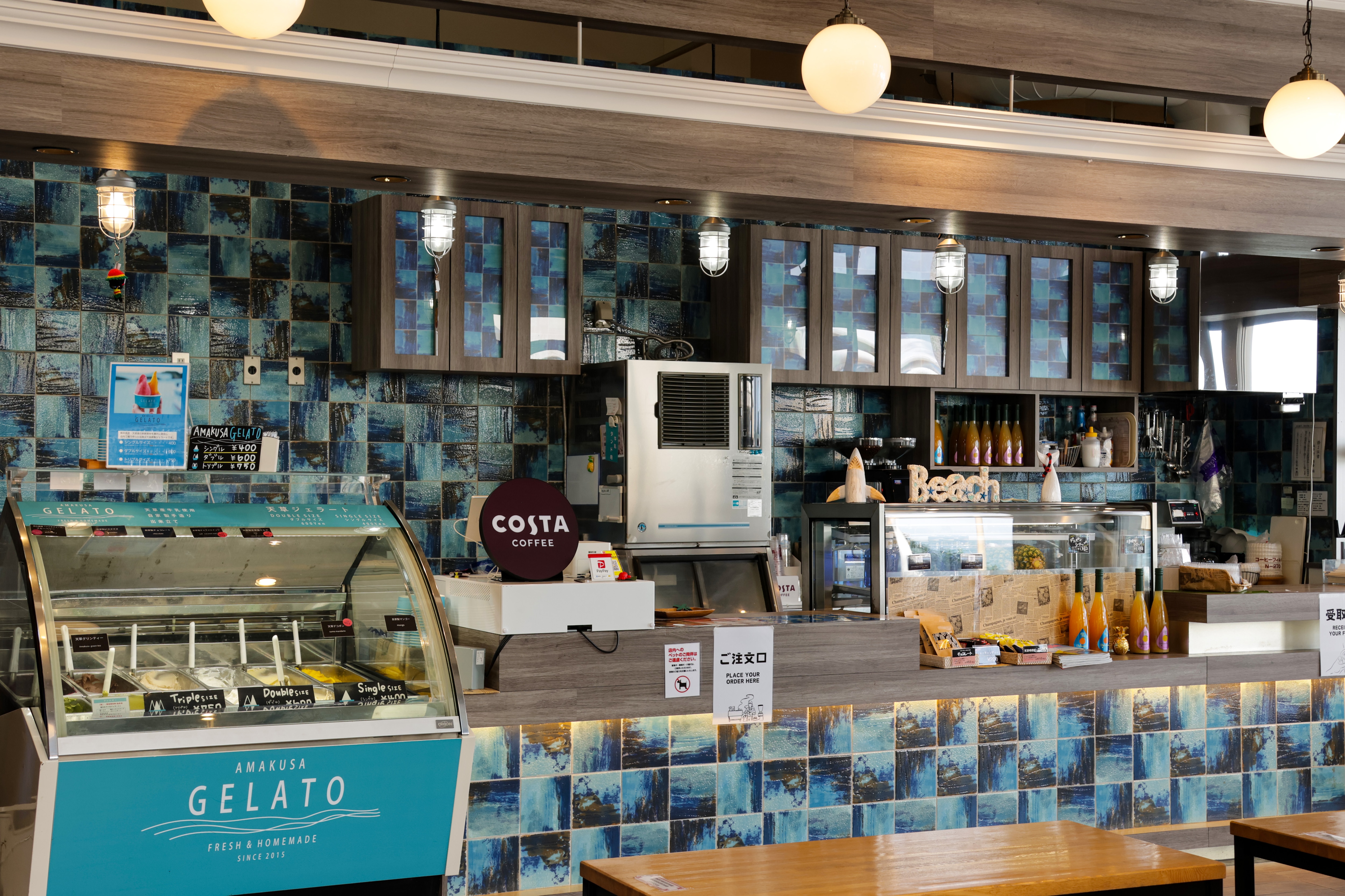 リゾラテラス天草内の、「アイランドスタンド」で本格的なイタリアンジェラートや味わい深いコスタコーヒーで休憩していきませんか。オープンデッキで海風を感じながら味わうスイーツとドリンクは格別で、観光の拠点にも休憩にも最適なスポットです。