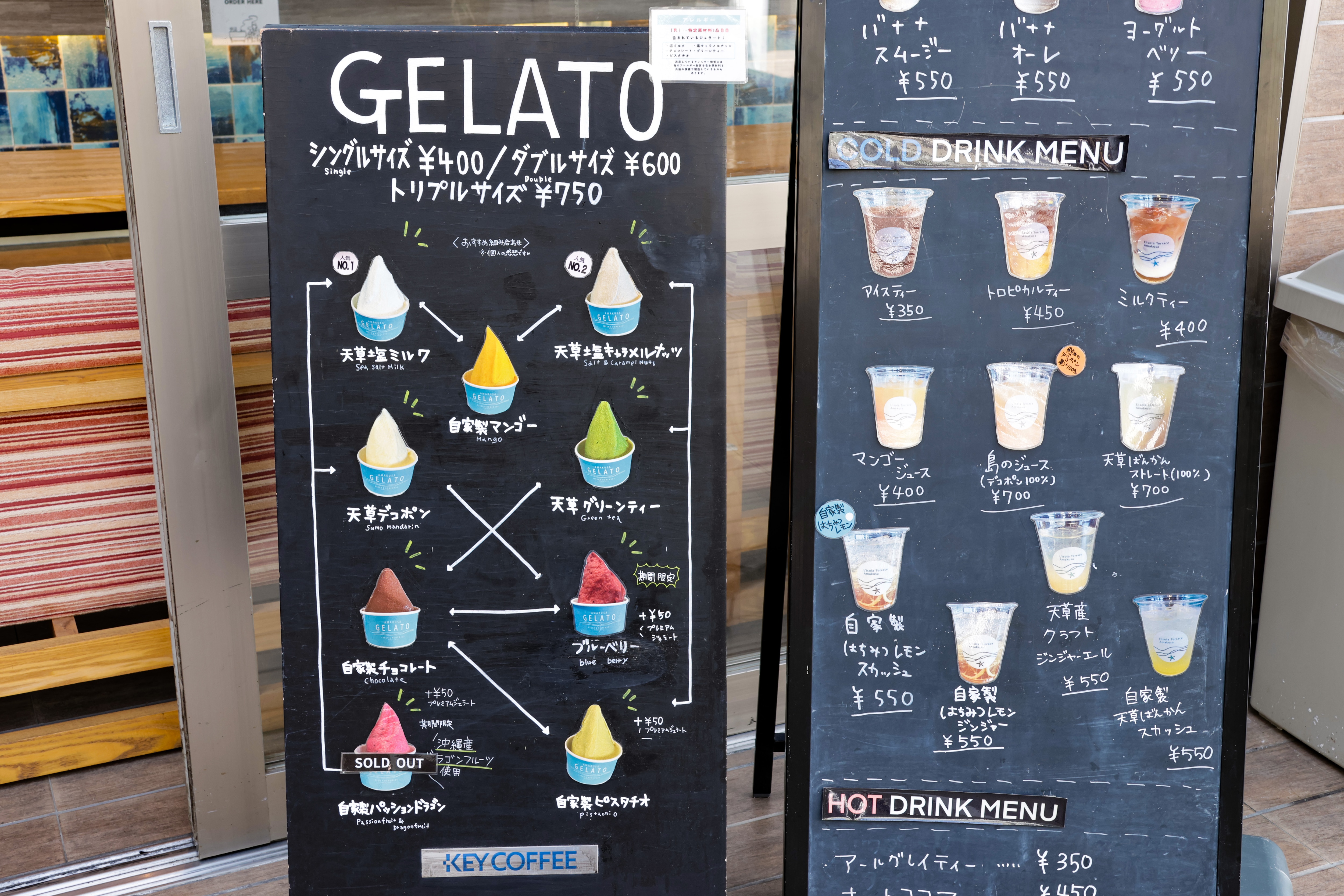 ジェラート以外にも、気分に合わせて選べるメニューが豊富。天草産の柑橘を使った「天草ばんかんストレート」やデコポンジュースはすっきり爽やかで、暑い日にもぴったり。